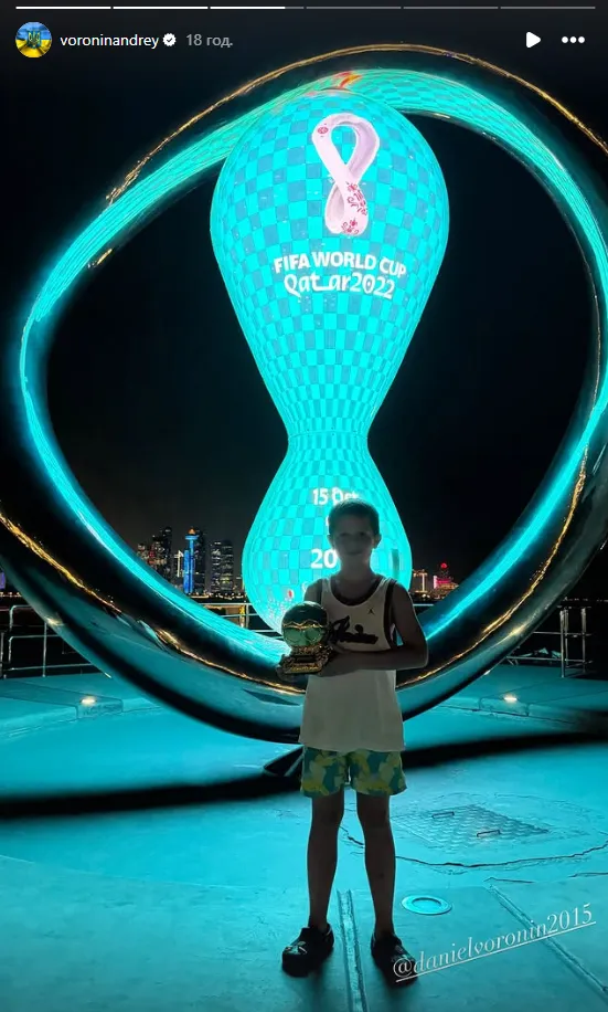 На знімку видно логотип чемпіонату світу-2022 у Катарі – ймовірно, сім’я перебуває саме там. Даніель, народжений у 2015 році, позує з нагородою, а поруч усміхається Андрій.