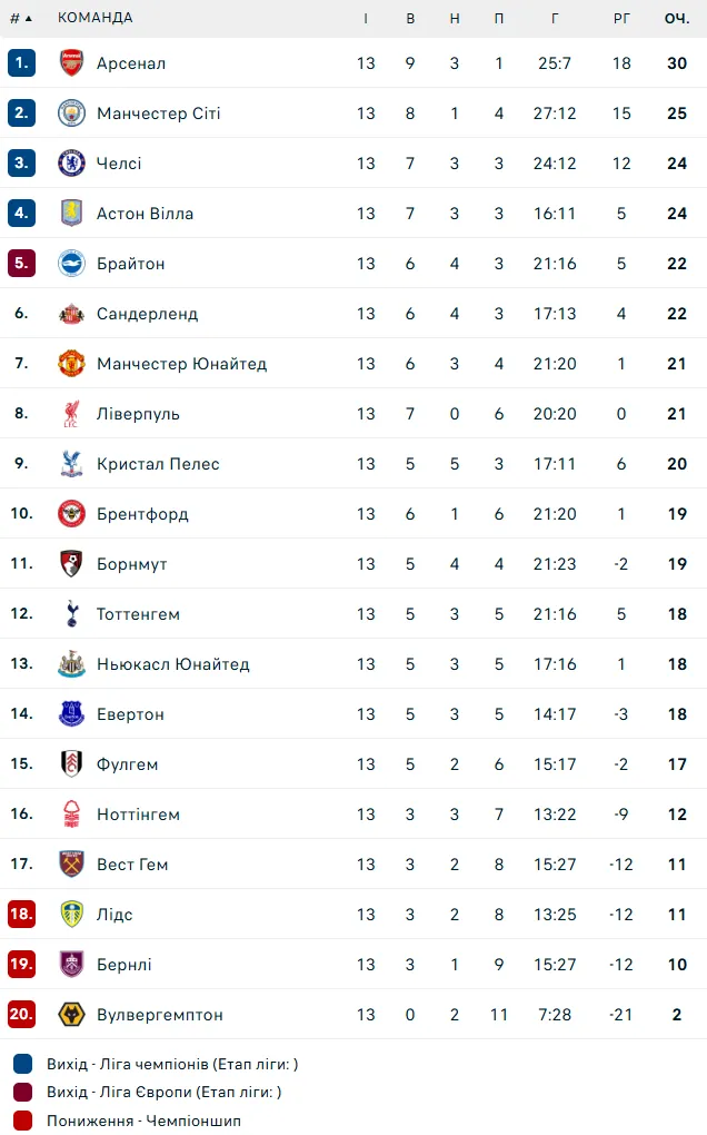 Турнірна таблиця Англійської Прем'єр-ліги після 13 турів.