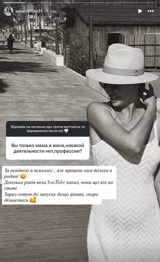 «За освітою я психолог, але працюю ним тільки в родині. Декілька років вела YouTube-канал, поки що він на стопі. Зараз готую до запуску дещо цікаве, скоро дізнаєтесь», – написала жінка.