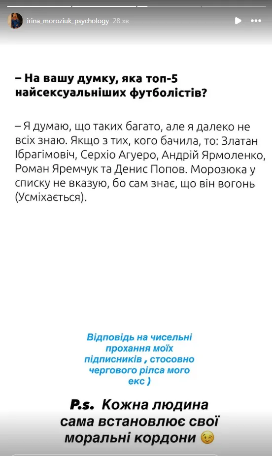 «Я думаю, що таких багато, але я далеко не всіх знаю. Якщо з тих, кого бачила, то: Златан Ібрагімовіч, Серхіо Агуеро, Андрій Ярмоленко, Роман Яремчук та Денис Попов. Морозюка у списку не вказую, бо сам знає, що він вогонь (усміхається)», – написала Ірина.