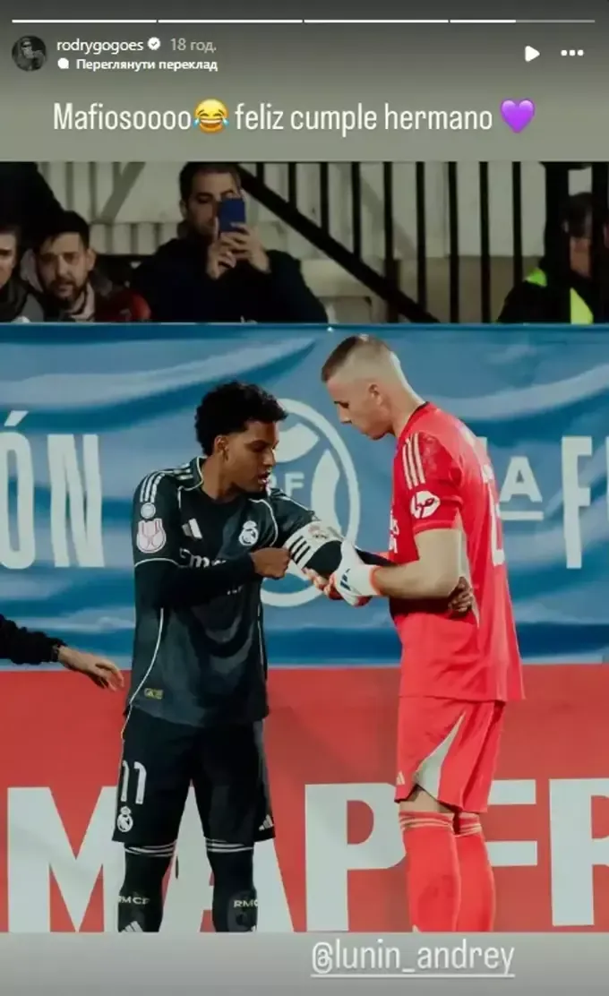 Особливу увагу привернув пост його одноклубника Родріго. Бразильський вінгер розмістив у сторіс фотографію Луніна і додав жартівливий підпис.