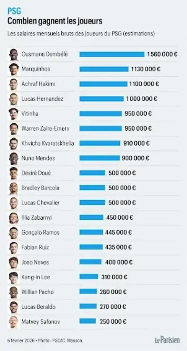 За інформацією джерела, найбільший оклад має володар «Золотого м'яча» 2026 року Усман Дембеле. На рахунок нападника раз на місяць надходить платіж у розмірі мільйон 560 тисяч євро (до сплати податків).