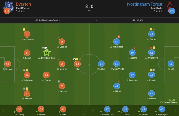 Головним героєм цієї зустрічі став Кірнан Дьюсбері-Холл, який відзначився забитим м'ячем і отримав найвищу оцінку серед футболістів обох команд – 8,5 бала.