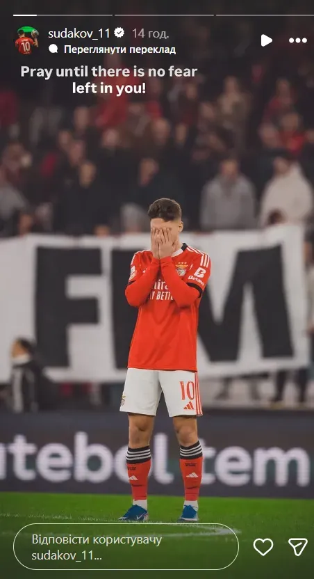 Український півзахисник Георгій Судаков з'явився у стартовому складі лісабонців та провів на полі 73 хвилини. Після завершення зустрічі хавбек збірної України поділився емоціями, опублікувавши пост у сторіс на своїй сторінці у Instagram.