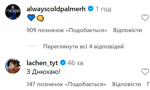 У коментарях під дописом відзначилися відомі особистості. Одноклубник Михайла та лідер Челсі Коул Палмер залишив смайли, висловивши підтримку партнеру. Також до привітань долучився популярний український блогер та волонтер Ігор Лаченков (Лачен).