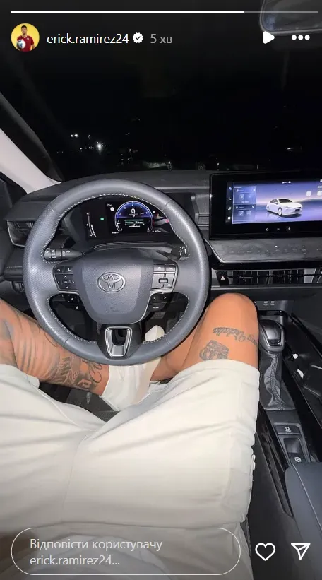 Нападник Динамо Ерік Рамірес, який на початку вересня перейшов на правах оренди у чеський Богеміанс 1905, у сторіс Instagram показав фото, на якому він сидить за кермом свого автомобіля.