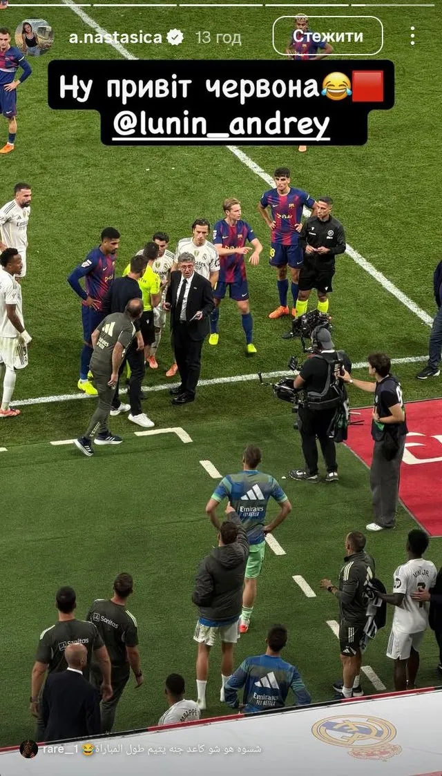 Лунін провів цей матч на лаві запасних, але в компенсований час опинився в центрі сутички між гравцями і був вилучений з поля червоною карткою. Анастасія спостерігала за грою на стадіоні «Сантьяго Бернабеу» і встигла сфотографувати емоційний момент за участю чоловіка. Після завершення поєдинку вона поділилася знімком у Instagram, прокоментувавши ситуацію.