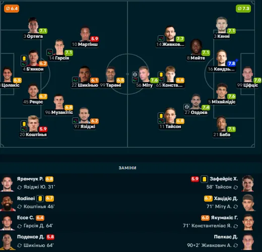 Український форвард команди з Пірея Роман Яремчук розпочав матч на лаві запасних, але вже на 31-й хвилині вийшов на поле та провів близько години.
