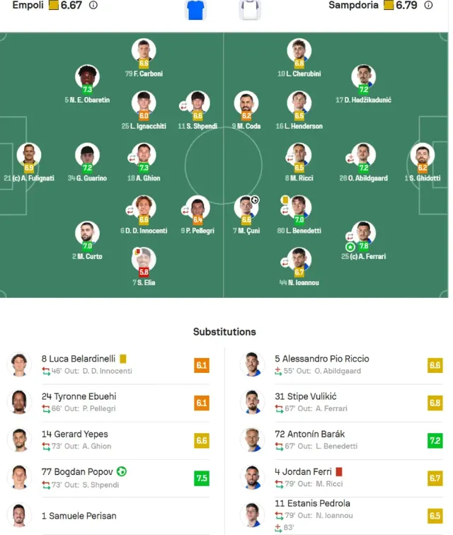 Український нападник Емполі Богдан Попов отримав оцінку за поєдинок проти Сампдорії, в якому йому вдалося відзначитися голом після виходу на заміну.