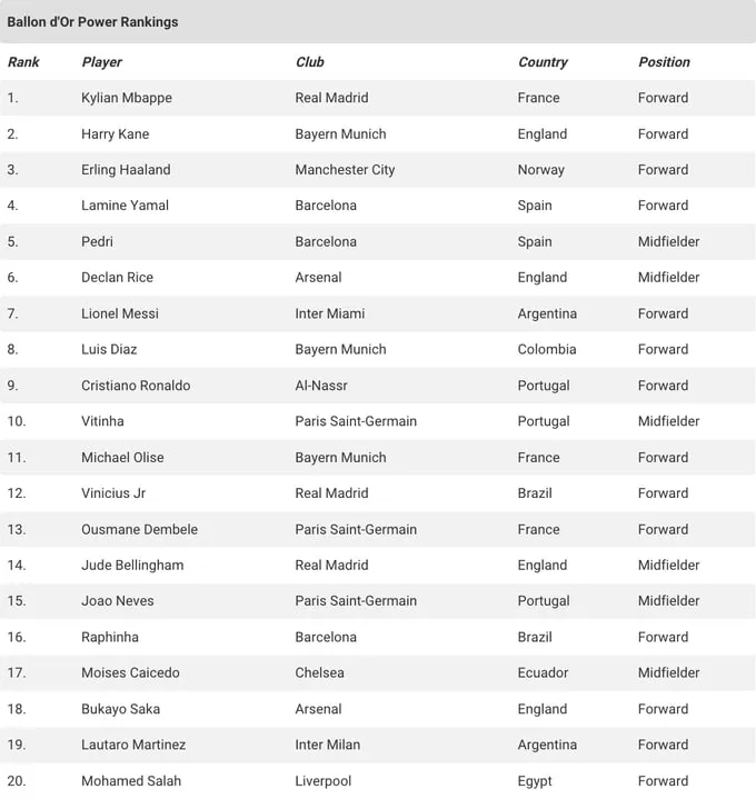 Зазначимо, що у цьому рейтингу присутні як Ліонель Мессі, так і Кріштіану Роналду, які на клубному рівні виступають за Інтер Майамі та Аль-Наср відповідно.