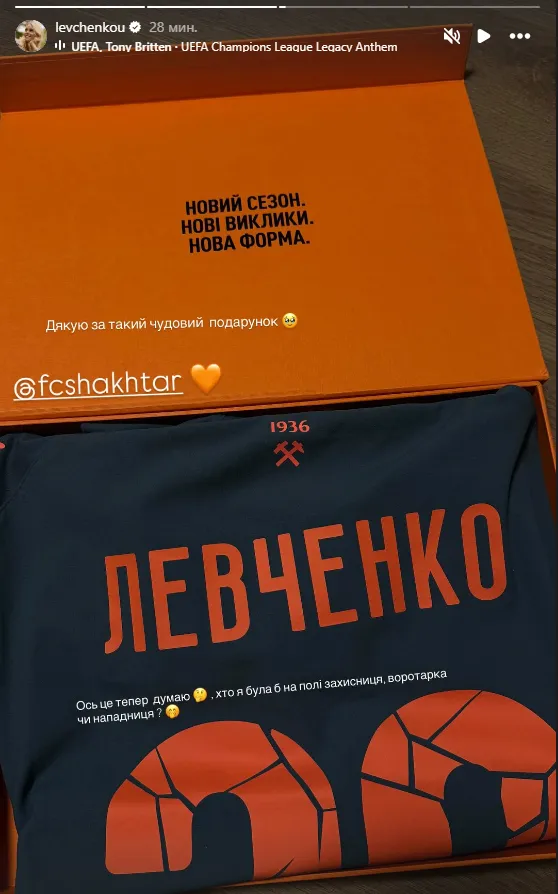 «Дякую за такий чудовий подарунок. Ось це тепер думаю, хто б я була на полі: захисниця, воротарка чи нападниця?», – написала Левченко під світлиною, де видно коробку з формою клубу з прізвищем Юлії.