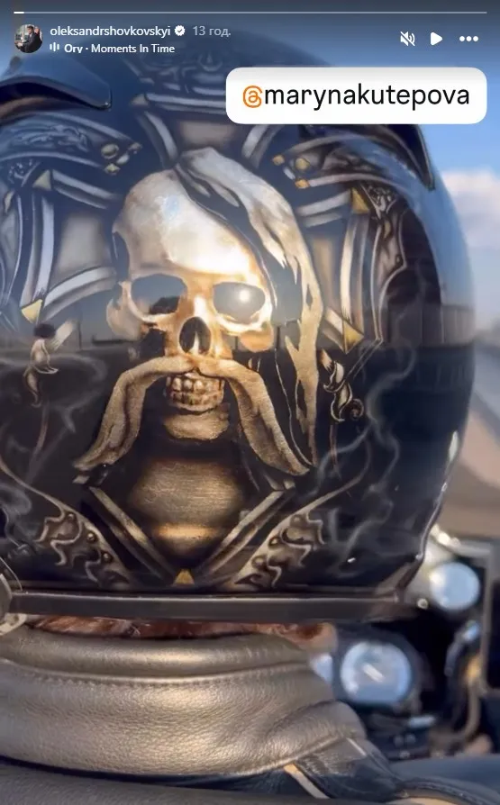 Олександр Шовковський у своєму Instagram опублікував фотографію шолома, в якому їздить на байку. На ньому зображено череп з вусами та характерним козацьким оселедцем на голові.