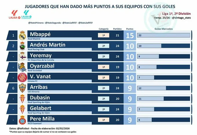 Іспанський портал StatsSegunda оновив рейтинг футболістів, які найбільше впливають на результати своїх команд. Аналітики підрахували, скільки очок кожен гравець приніс своєму клубу завдяки голам.