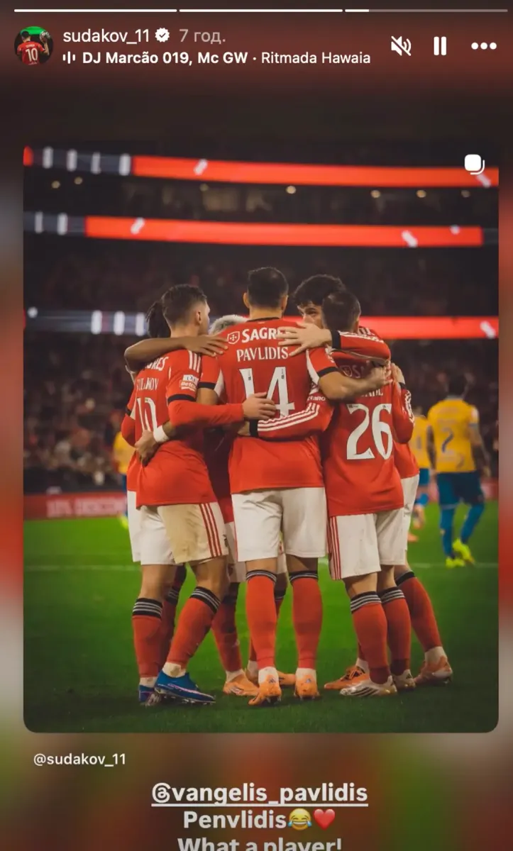 Пізніше хавбек додав кадр із Павлідісом і розкрив нове прізвисько грецького форварда, ймовірно, придумане самим українцем. Зважаючи на вбивчу реалізацію пенальті Павлідісом, Судаков лаконічно підписав фото: