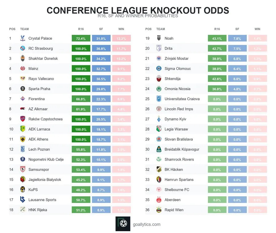 Аналітичний ресурс Goallytics у соцмережі Х опублікував свої прогнози щодо переможця поточного розіграшу Ліги конференцій УЄФА 2025/26.