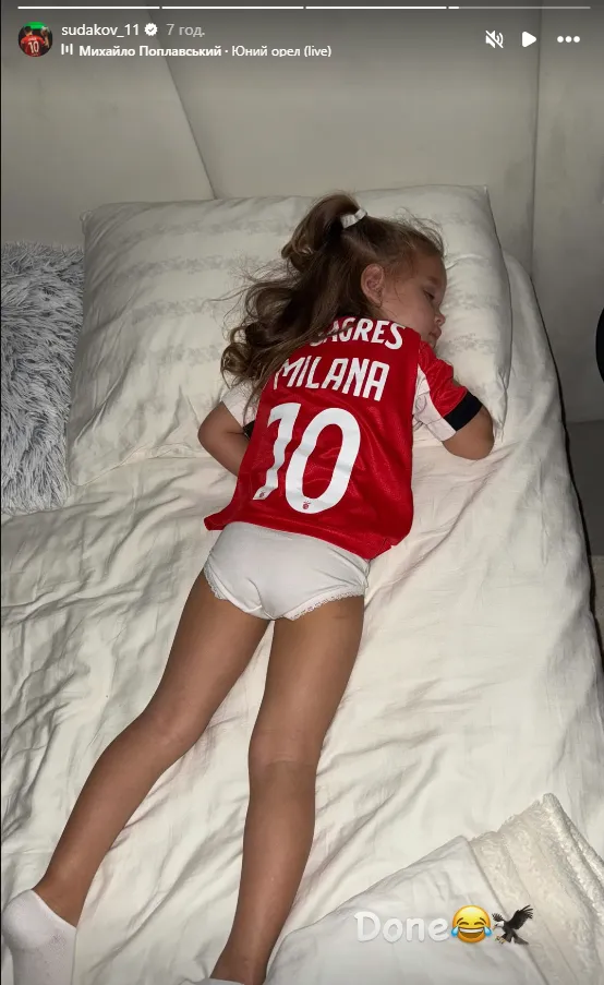 А вже після цього поєдинку півзахисник збірної України на своїй сторінці у соцмережі Instagram виклав світлину своєї доньки Мілани, яка спала у футболці «орлів» зі своїм іменем та 10-м номером на спині.