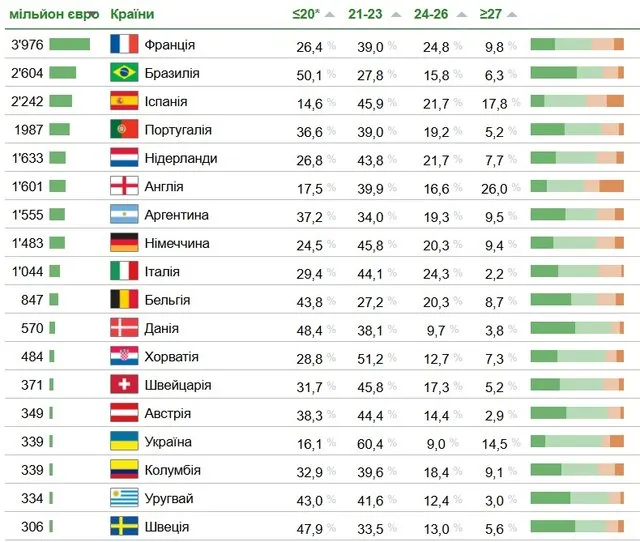 Лідером списку, як і очікувалося, стала Франція, адже сукупний дохід від трансферів її футболістів склав майже чотири мільярди євро. Слідом розташувалася Бразилія з показником 2,6 мільярда. До першої п'ятірки також увійшли Іспанія, Португалія та Нідерланди.