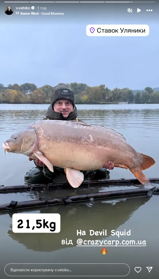 Через декілька годин Вацко похвалився значно більш «ефектним» здобутком, а саме рибою-гігантом. На іншому фото він тримає свій трофей вагою 21,5 кілограма. У підписі до знімка журналіст зазначив, що короп був спійманий на ставку в Уляниках завдяки наживці Devil Squid від українського бренду.