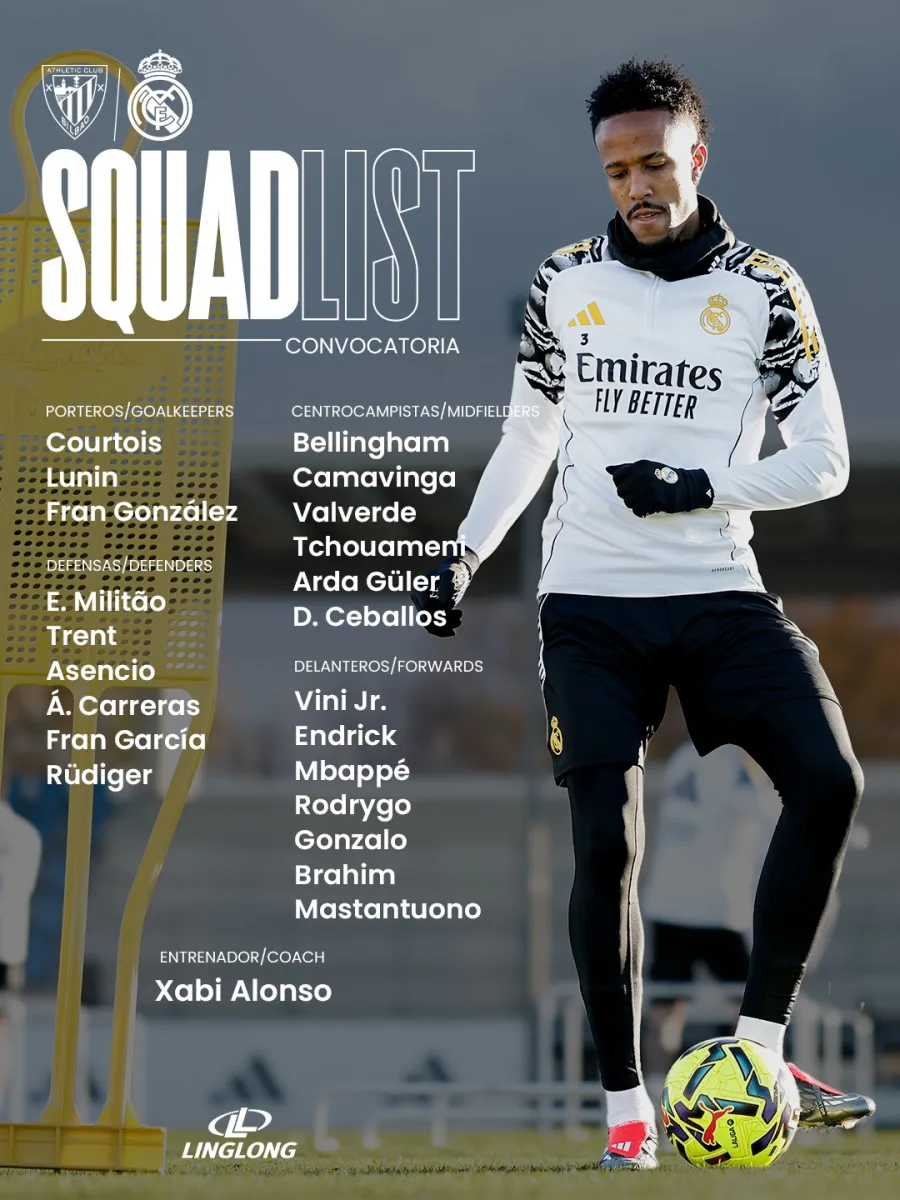 Реал оголосив заявку на матч 19-го туру Ла Ліги проти Атлетіка і Хабі Алонсо включив до списку 22 футболістів. Перед зустріччю команда має певні кадрові труднощі в обороні, спричиненими цілою серією травм.