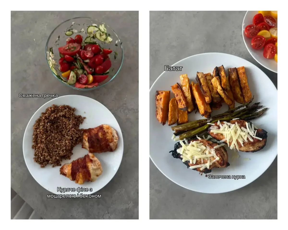 - Смажена гречка, куряче філе з моцарелою і беконом, запечена курка і батат.