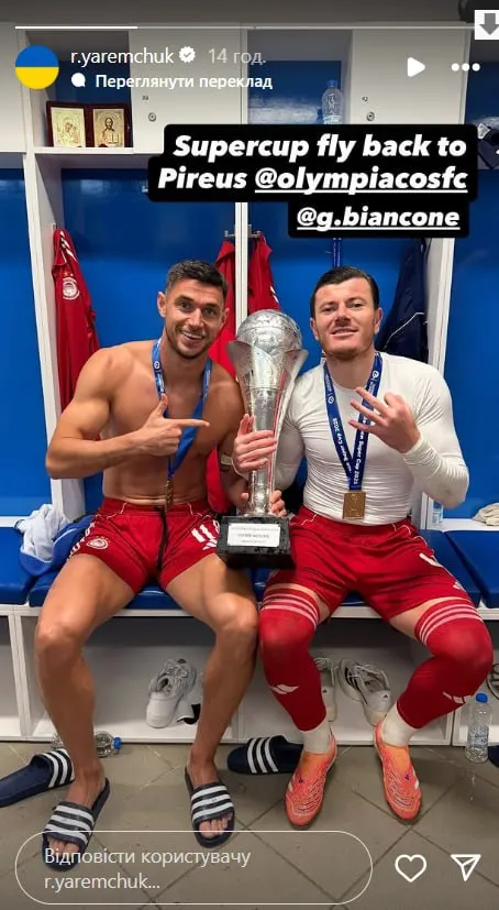 Український форвард Олімпіакоса Роман Яремчук в розповідях свого Instagram прокоментував перемогу над ОФІ в Суперкубку Греції (3:0).