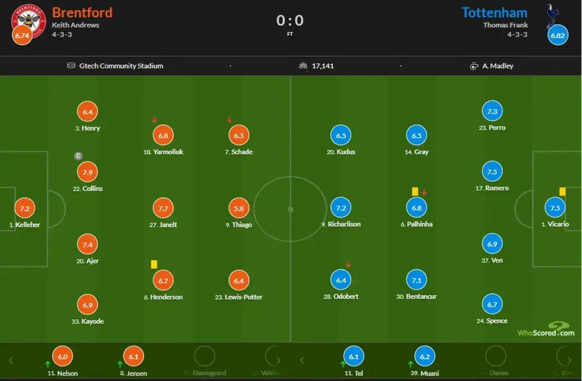 - Брентфорд наразі посідає дев'яте місце в чемпіонаті з 27 очками в 19 зустрічах. Нічия зі «шпорами» дозволила команді піднятися в десятку кращих команд АПЛ.