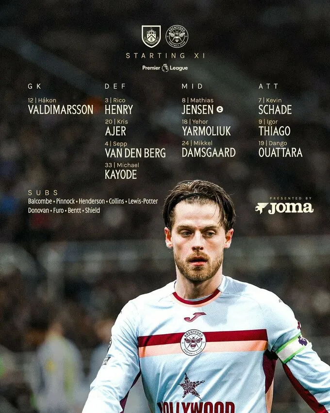Півзахисник Брентфорда та збірної України Єгор Ярмолюк вийде у стартовому складі на матч 28-го туру Англійської Прем'єр-ліги. Зустріч відбудеться 28 лютого на стадіоні «Turf Moor» проти Бернлі та розпочнеться о 17:00 за київським часом.