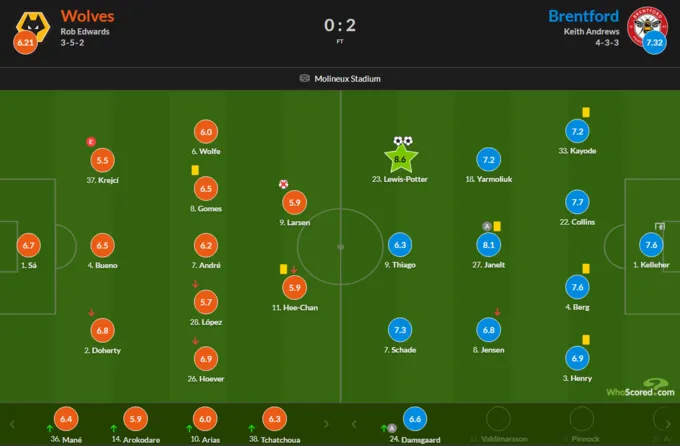 Центральний півзахисник Брентфорда Єгор Ярмолюк дізнався свою оцінку за поєдинок 17-го туру чемпіонату Англії проти Вулвергемптона, який завершився перемогою червоно-білих з рахунком 2:0.