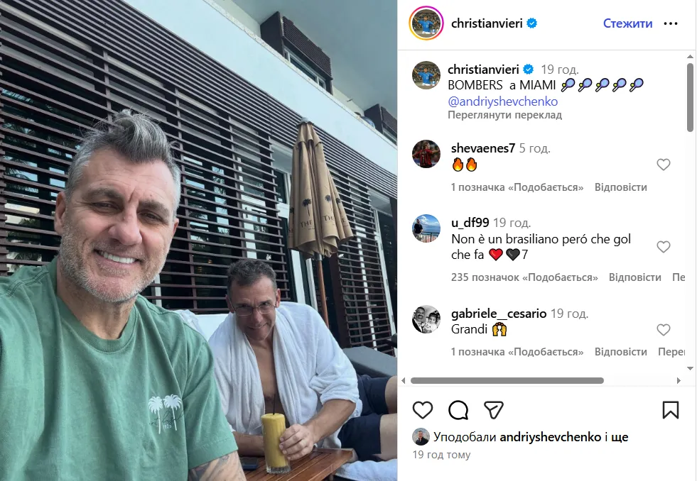 52-річна ексзірка збірної Італії опублікував фото з відпочинку у власному Instagram, де на сусідньому шезлонзі розташувався легендарний український ексфорвард.