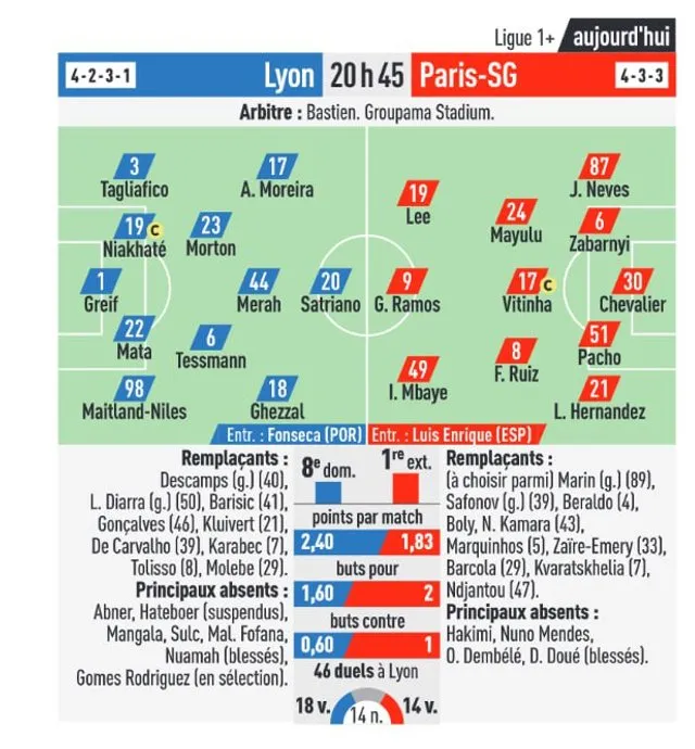 Ситуація із позицією правого захисника залишається відкритою. Через травму Ашрафа Хакімі Луїс Енріке змушений шукати альтернативу. За версією L'Équipe місце в основі отримає Жоау Невеш, тоді як Le Parisien бачить на фланзі вінгера Сенні Маюлю. Сам наставник ПСЖ на прес-конференції зазначив, що планує надати шанс вихованцю академії Давіду Болі.