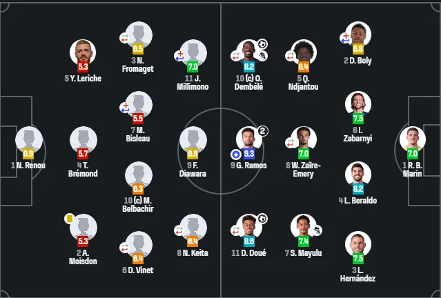 Український центральний захисник парижан Ілля Забарний вийшов у стартовому складі та провів на полі всі 90 хвилин. Його дії отримали високу оцінку від аналітичного сервісу SofaScore, а саме 7,5 бала.