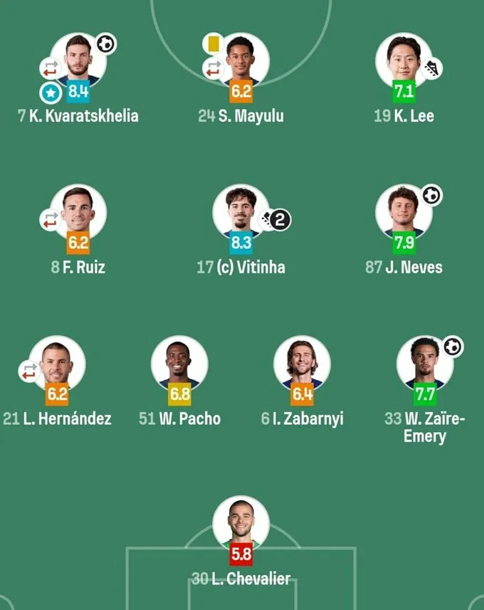 Найкращим гравцем матчу став Хвіча Кварацхелія, який отримав 8,4 бала і відзначився забитим м'ячем у першому таймі.