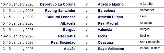 - Поєдинки 1/8 фіналу Кубка Іспанії заплановані на 13-15 січня 2026 року, точний час початку матчів буде оголошено додатково.
