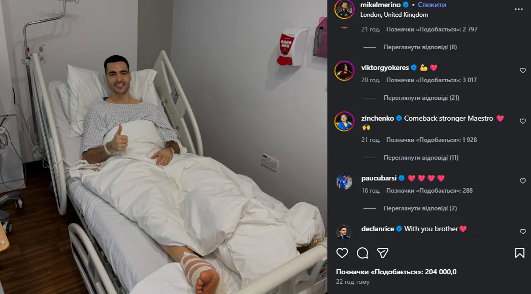 Олександр Зінченко продовжує підтримувати футболістів, із якими раніше виступав в Арсеналі. Півзахисник «канонірів» Мікель Меріно отримав перелом стопи та вибув до кінця поточного сезону.