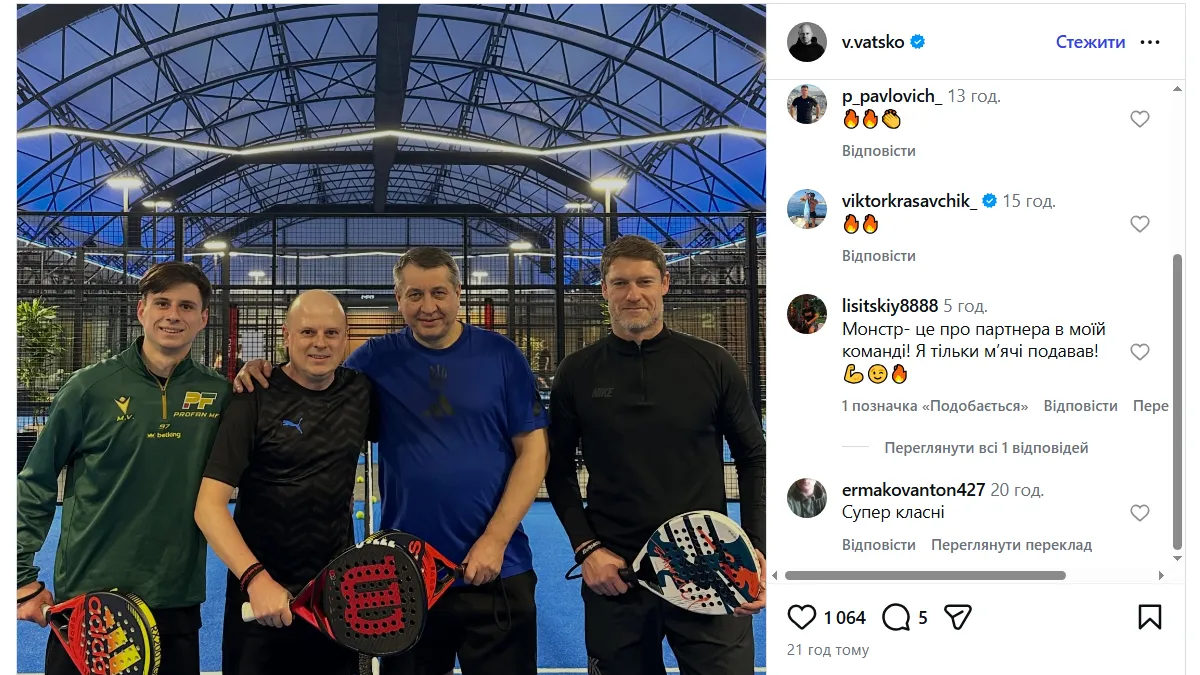 «Падел – це можливість підтримувати фізичні кондиції та чудовий спосіб комунікації і підтримання стосунків. Особливо, коли мова йде про людей, яких знаєш не один десяток років! Мушу визнати, Віталік Лисицький – монстр в паделі! Як мінімум, на нашому рівні! 😄», – написав Вацко.