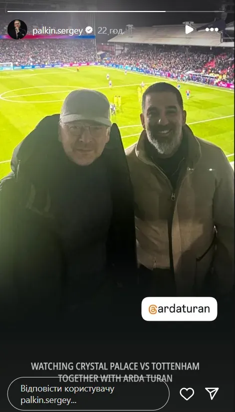 «Перегляд матчу Крістал Пелас – Тоттенхем разом з Ардою Тураном», – підписав фото Палкін.