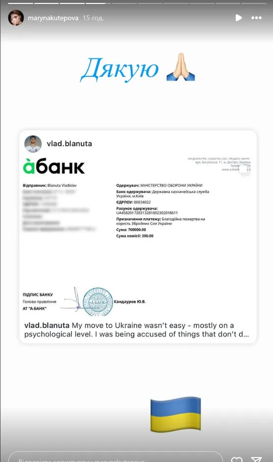 Жінка головного тренера київського Динамо Олександра Шовковського Марина Кутепова подякувала нападнику біло-синіх Владіславу Бленуце за його щедру пожертву на потреби Збройних сил.