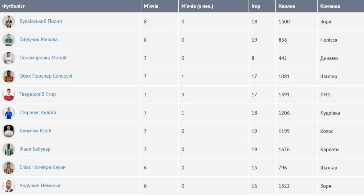 Одразу шість гравців мають по сім голів. Серед них виділяється 20-річний форвард Динамо Матвій Пономаренко, якому для цього вистачило лише вісім матчів.
