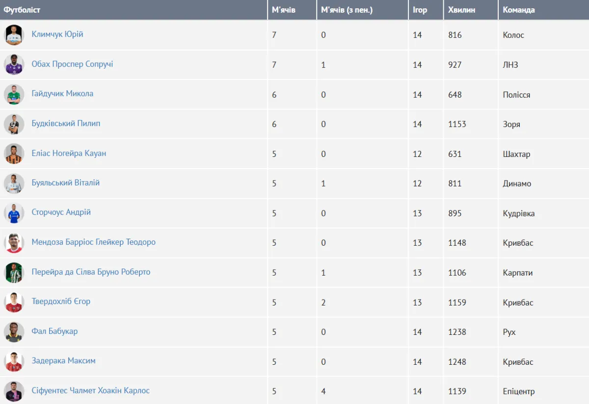 Нападник ковалівського Колоса Юрій Климчук очолює бомбардирські перегони української Прем'єр-ліги 2025/26, забивши сім голів за 14 поєдинків.