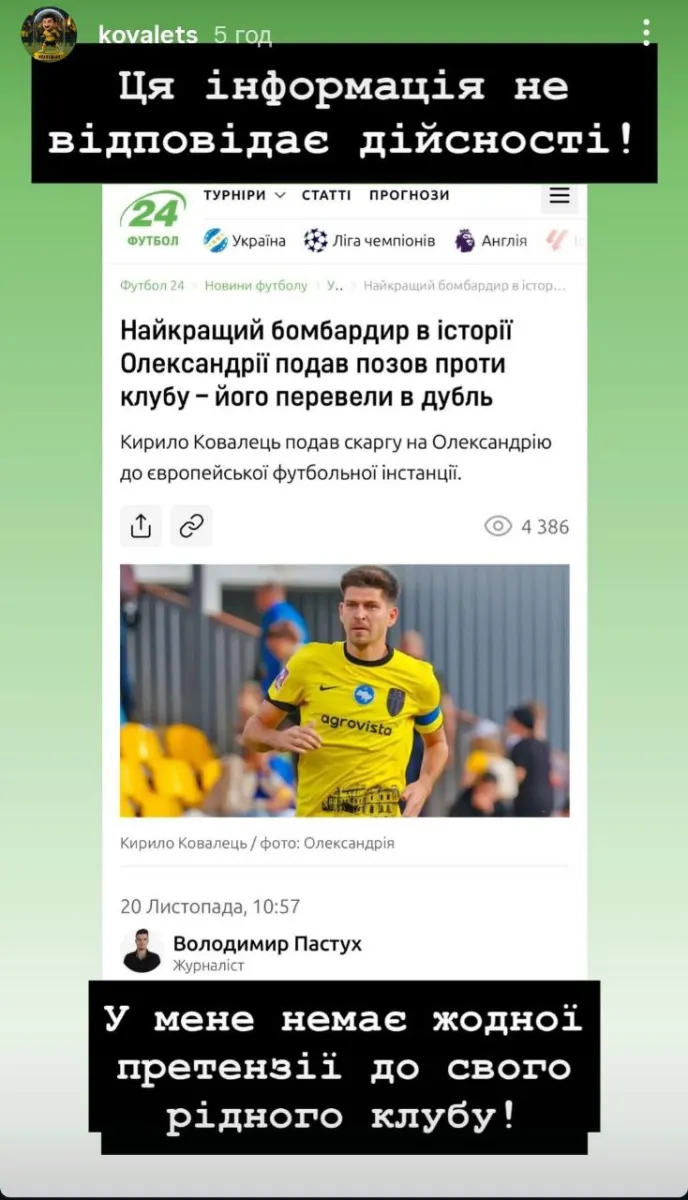 Кирило Ковалець вийшов зі спростуванням інформації, що нібито капітан Олександрії подав позов в клуб.