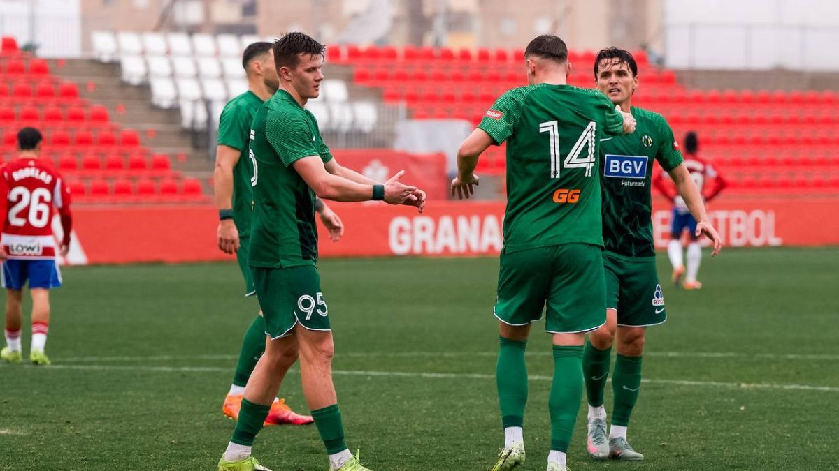 Гравці Полісся святкують гол у ворота Гранади. Олександр Андрієвський крайній праворуч. Фото: ФК Полісся (Житомир)