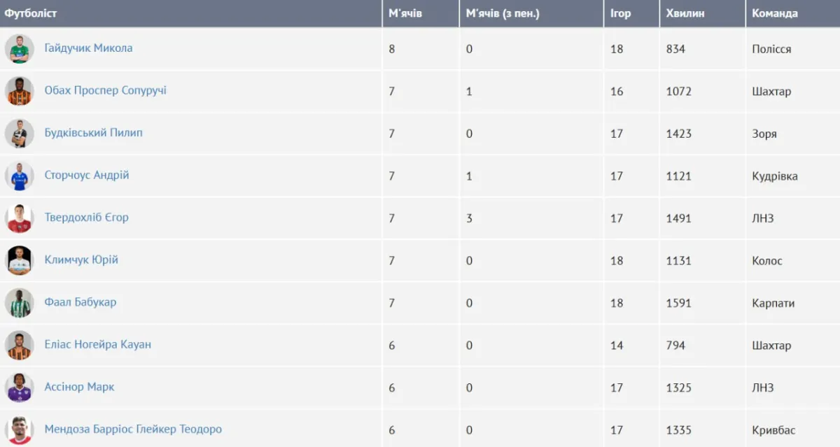 Одразу шестеро футболістів дихають у спину лідеру, маючи у своєму доробку по сім влучних ударів. Серед них Проспер Оба, Пилип Будківський, Андрій Сторчоус, Єгор Твердохліб, Юрій Климчук та Бабукар Фаал.