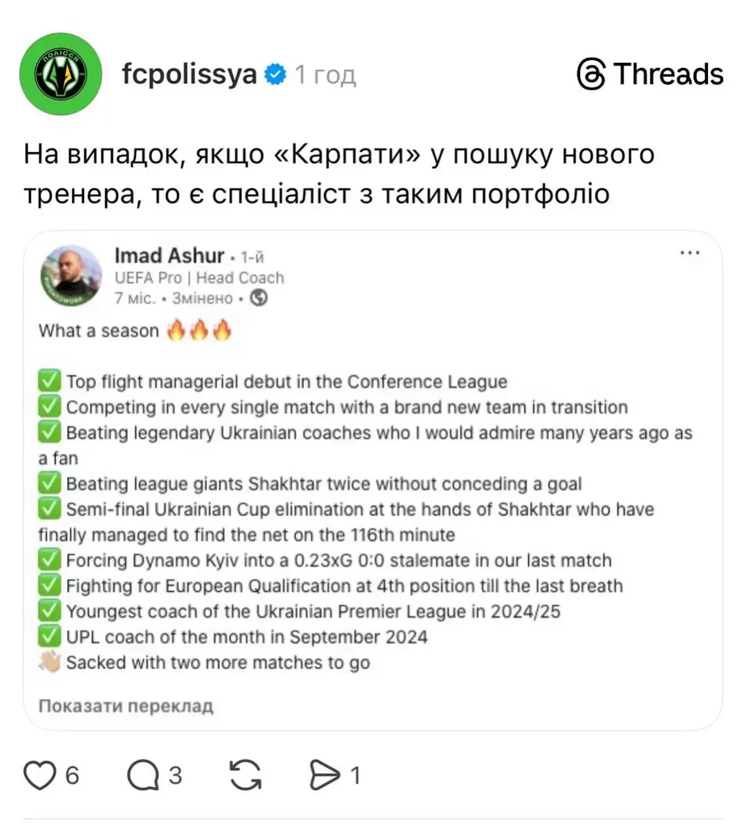 У соціальній мережі Threads житомирський клуб опублікував старий запис Імада Ашура, в якому фахівець підбивав підсумки своєї роботи на Поліссі. Пост супроводжувався іронічним підписом.