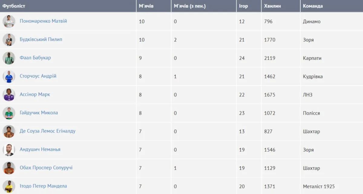 За підсумками 24-го туру чемпіонату України в бомбардирських перегонах встановлено двовладдя. Молодий форвард київського Динамо Матвій Пономаренко та досвідчений нападник луганської Зорі Пилип Будківський мають в активі по 10 голів.