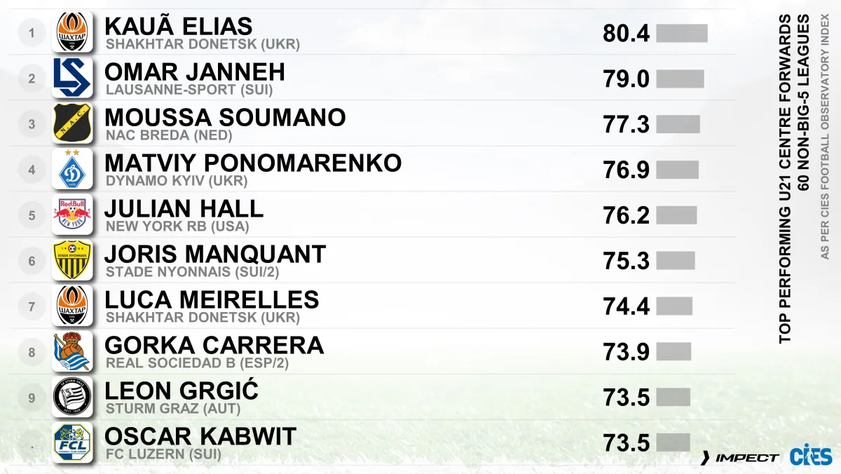 Міжнародний центр спортивних досліджень CIES у мережі Х оприлюднив рейтинг найефективніших молодих нападників віком до 21 року. До цього списку увійшли виключно представники чемпіонатів, які не входять до традиційної європейської топ-п'ятірки.