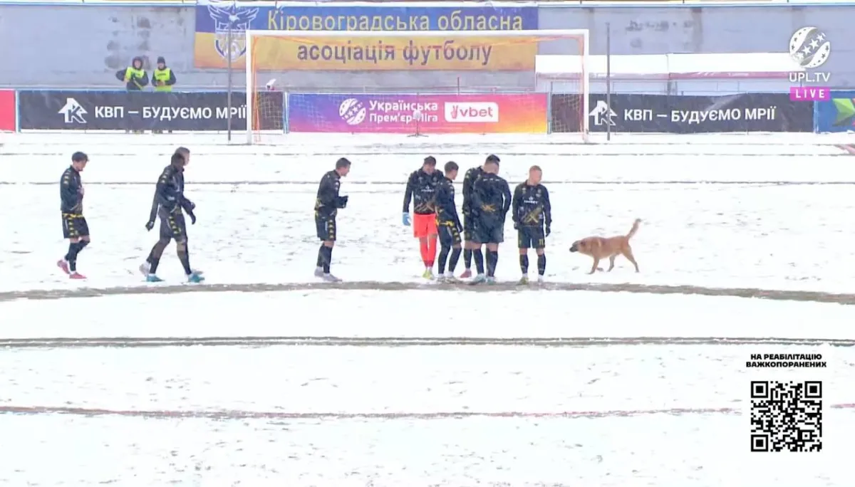 Початок матчу між СК Полтава та львівським Рухом двічі був під загрозою зміщення по часу: спершу занепокоєння викликав стан поля, яке рясно припорошило снігом, а згодом, коли газон розчистили, до гри вирішив долучитися пес!