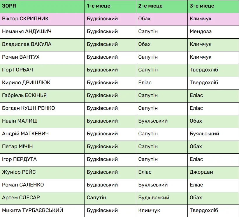Солідарні зі своїм наставником, щодо найкращого гравця, були 14 з 15 футболістів Зорі й лише Артем Слесар поставив на перший щабель не Будківського.