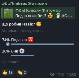Після матчу Полісся у власному телеграм-каналі опублікувало опитування, що робив Назаренко в момент виконання стандарту: подавав чи пробивав.