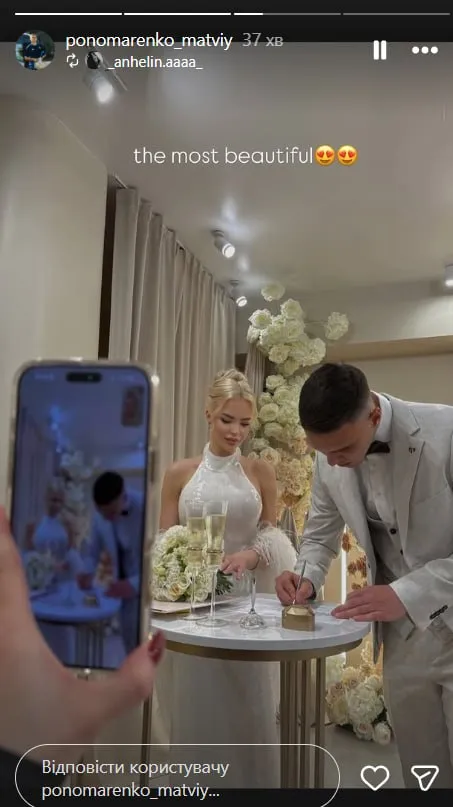 У середу, 8 квітня, стало відомо, що нападник київського Динамо та національної збірної України Матвій Пономаренко офіційно зіграв весілля та уклав шлюб зі своєю коханою дівчиною Дариною, про що стало відомо зі сторіс в його Instagram.