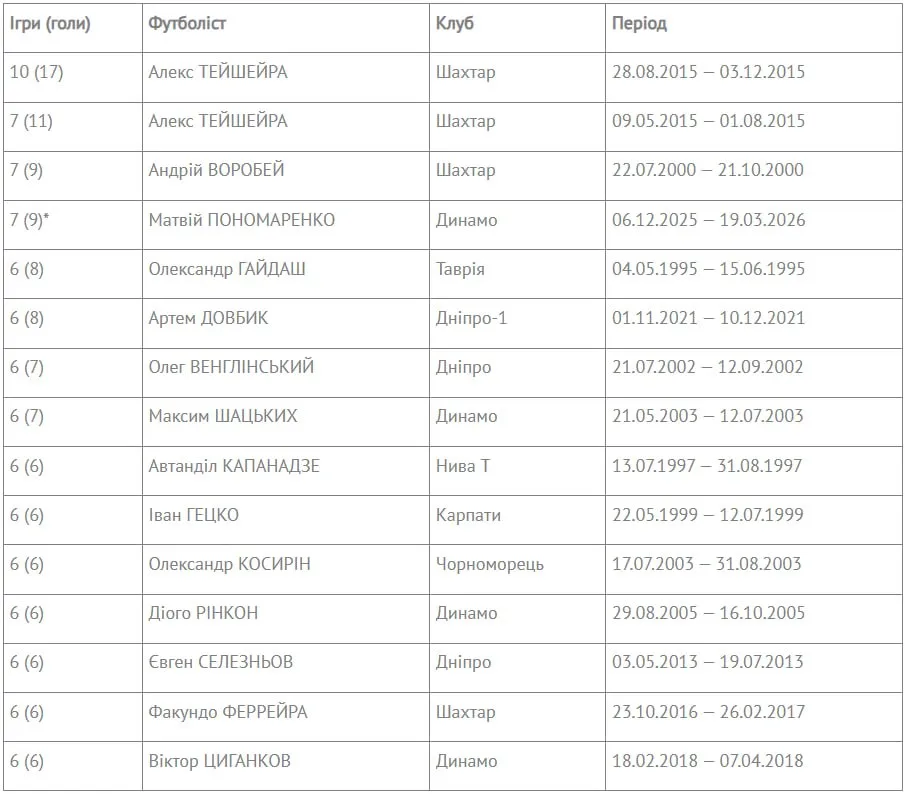 Рекордсменом за всю історію є бразильський хавбек Алекс Тейшейра, який виступав за донецький Шахтар. У 2015 році він забивав у 10 іграх поспіль.